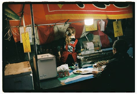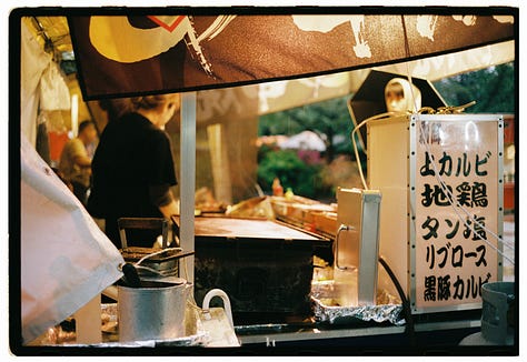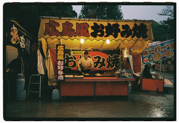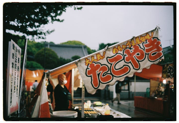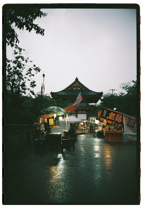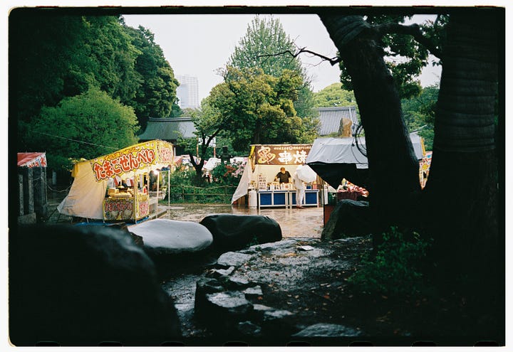 The rain comes down big and heavy. The stalls sag, the tents sag, the plastic seating and tables do their best imitation of a sag. We have umbrellas and an iron will. Or the boy does. Ignorance is bliss, and the idea of a Kakigōri could propel him across the globe no matter how many times you explain that ice and rain together can only be a sad time.